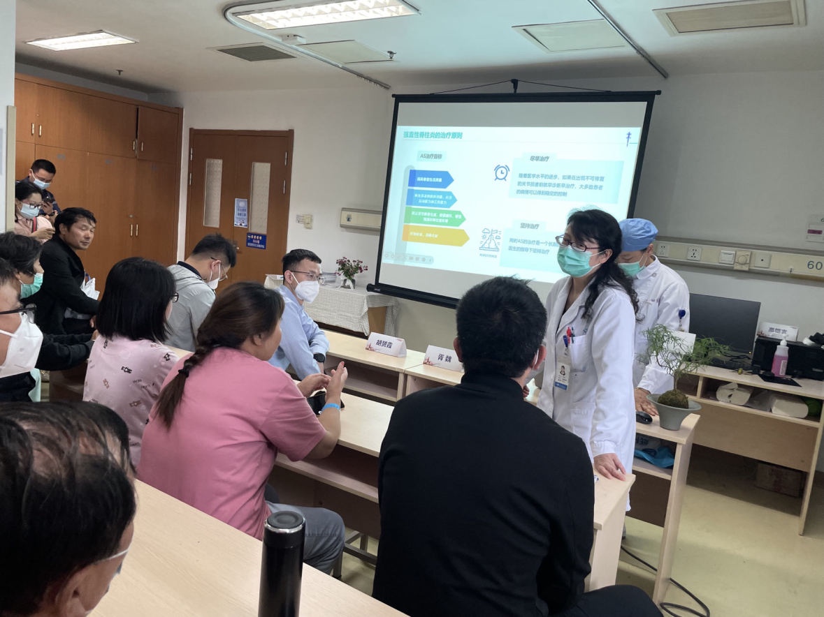 同時,為“讓中軸型強直性脊柱炎患者動起來”,魏教授還指導患者學會在生活中如何進行自我健康管理,因為有效的功能鍛煉和活動鍛煉能提高患者身體及精神上的健康,幫助患者降低腰背部的僵硬和疼痛,提高睡眠質量,增加身體能量。
