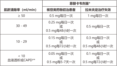 肌酐清除率<50mL/min,包括血液透析或CAPD的患者,建議調整恩替卡韋的給藥劑量(見【用法用量】)。