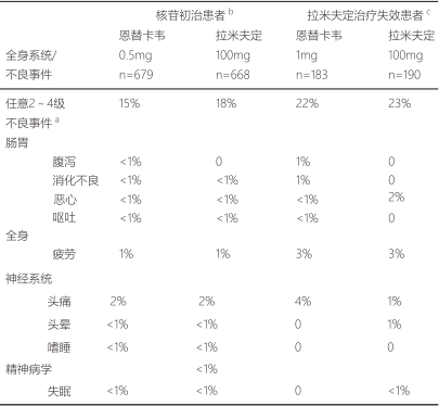 表2比較了在4項臨床研究中恩替卡韋和拉米夫定的不同。其中選擇了中到重度不良事件和治療過程中發生的至少有可能與治療相關的臨床不良事件作為比較的指標。
