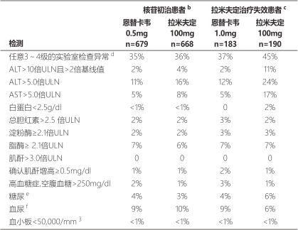 表3四項臨床試驗中使用恩替卡韋和拉米夫定治療后,實驗室檢查異常的發生頻率。