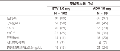 96周期間,ETV組和ADV組治療相關的2-4級AEs發生率相似(分別是13%和16%)。